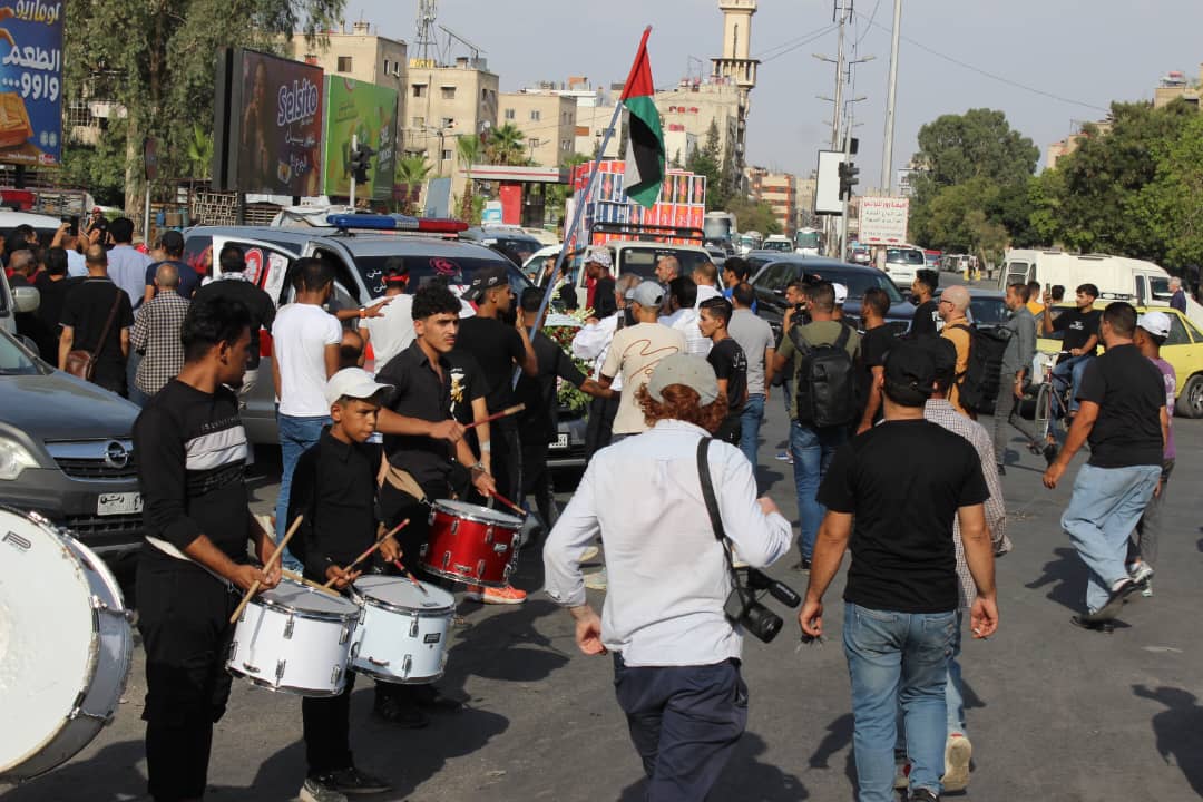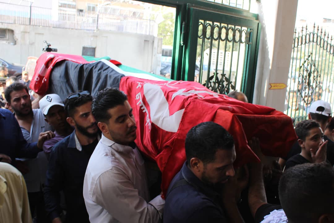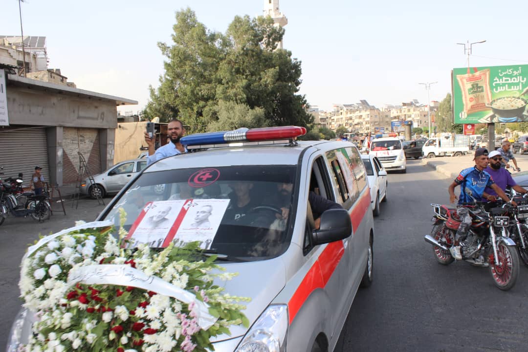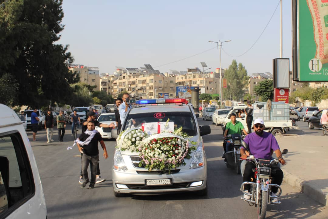 وانطلقت الجنازة من أمام مشفى المجتهد الساعة الرابعة عصراً، باتجاه جامع الماجد ومن ثم سار موكب التشييع حتى مقبرة الشهداء في مخيم اليرموك.