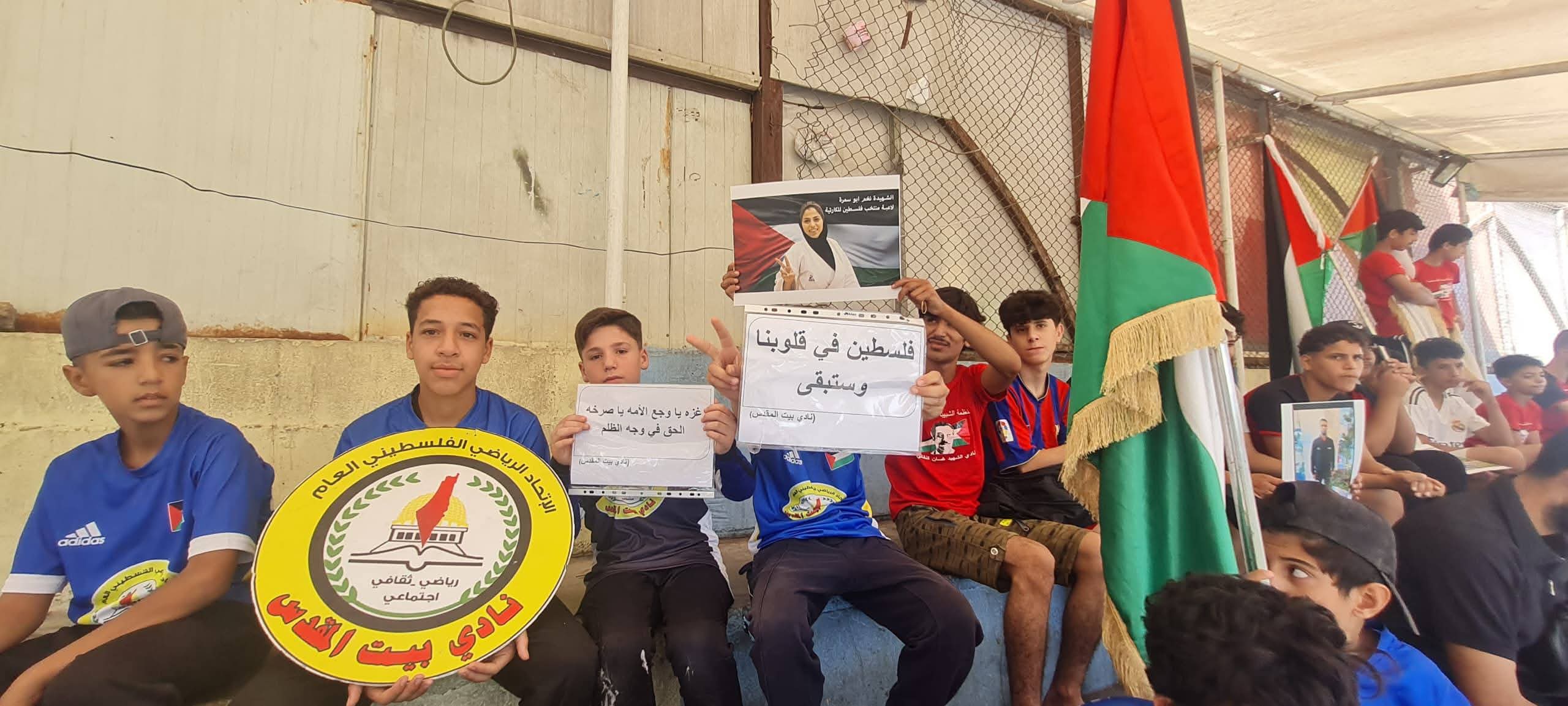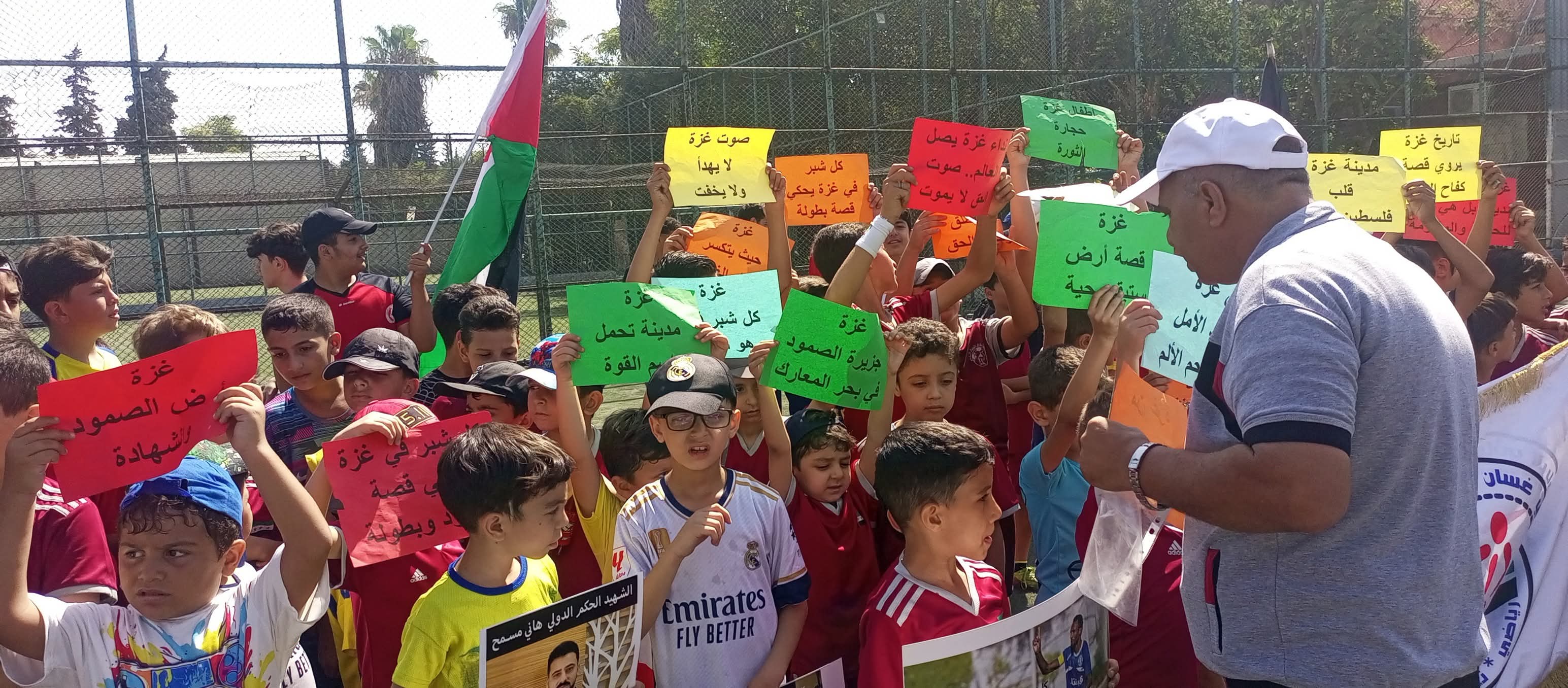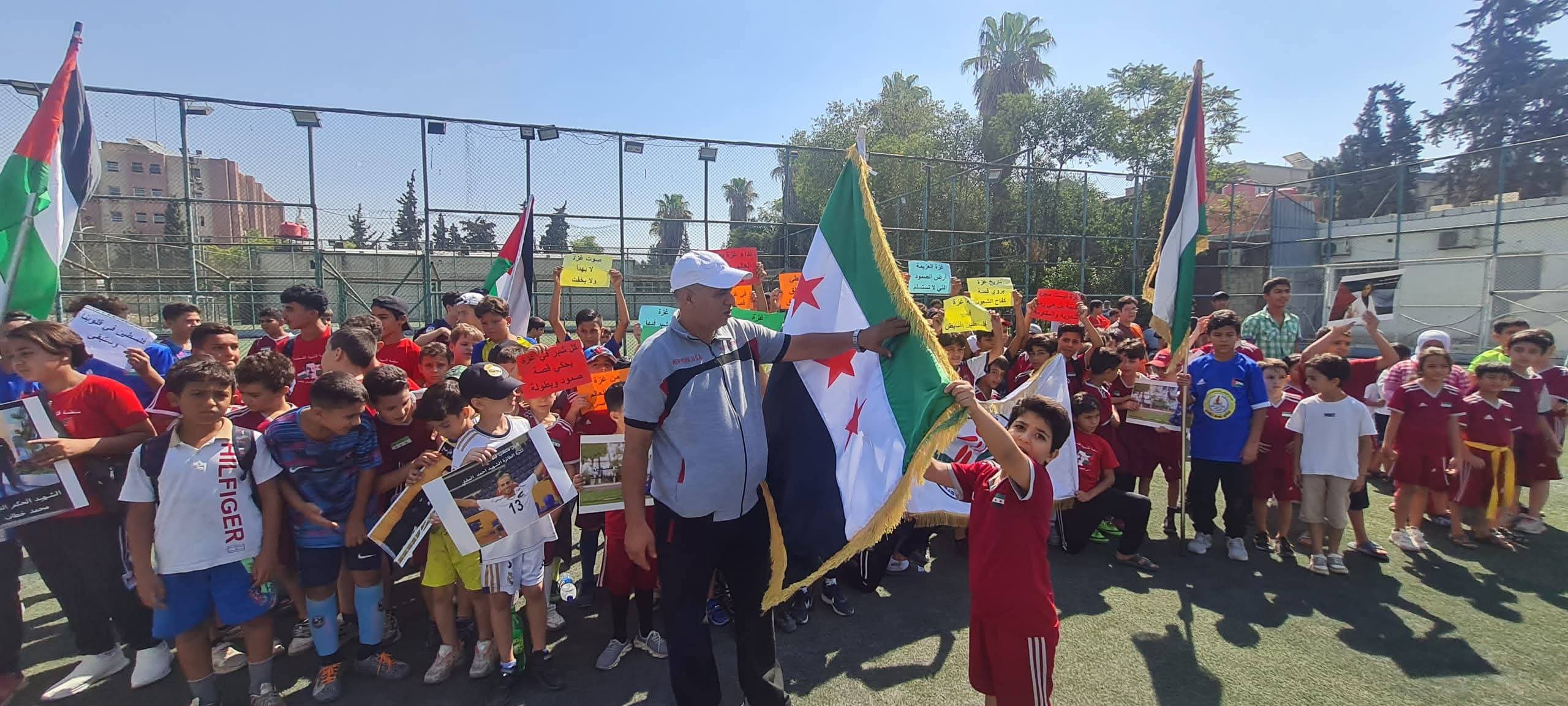 عبر أطفالنا اللاعبين عن تضامنهم مع أهلنا في قطاع غزة من خلال رسائل وصور توثق جرائم الاحتلال، وفي رسالة أحد الأطفال الصغار يقول ( أنا سوري وأرفض أن أرى أخي الفلسطيني يموت جوعاً دون أن يساعده أحد )